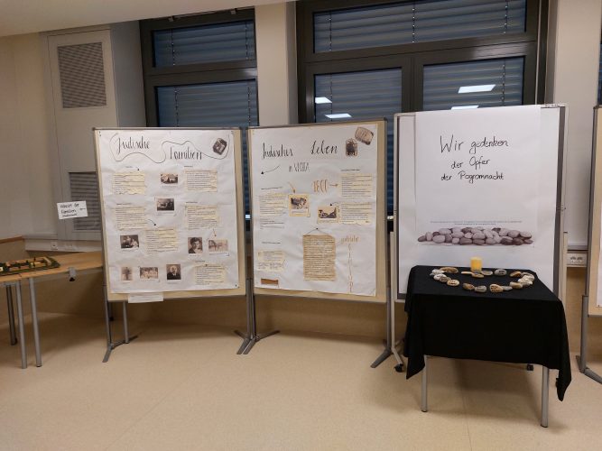Aufgrund der zeitlichen Nähe der BNE-Woche zum 9. November war eines der Schwerpunktthemen der Projektwoche das Gedenken an das Pogrom gegen die Juden am 9. November 1938. Die Klassen 12 des Beruflichen Gymnasiums gestalteten eine Museumsausstellung zum Thema „Spuren des Nationalsozialismus in Vechta“ mit Plakaten, einem Video zu geschichtsträchtigen Orten in Vechta sowie einem Zeitzeugeninterview. Großer Dank gilt dem Museum im Zeughaus, das verschiedene Ausstellungsstücke aus der Zeit, z. B. einen Volksempfänger (Radio), als Leihgaben zur Verfügung stellte. Dadurch wurde den Schülerinnen und Schülern die Echtheit der Geschehnisse noch stärker bewusst.