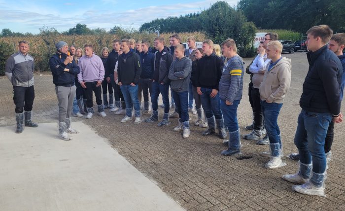 Die nächste Station der Fachexkursion im Rahmen des Modul 6 Optionale Lernangebote waren zwei Hähnchenmastställe Tierwohl Stufe 3 eines Landwirtes in Bösel. Das war eine echte Premiere, denn die Schüler konnten sich den ersten Durchgang der vor kurzem umgebauten, 40 Jahre alten Putenmastställe anschauen. Das Thema Nutzungsänderung von Altgebäuden zu neuen Hähnchenmastställen beschäftigt aufgrund der aktuellen Marktsituation derzeit viele Landwirte.