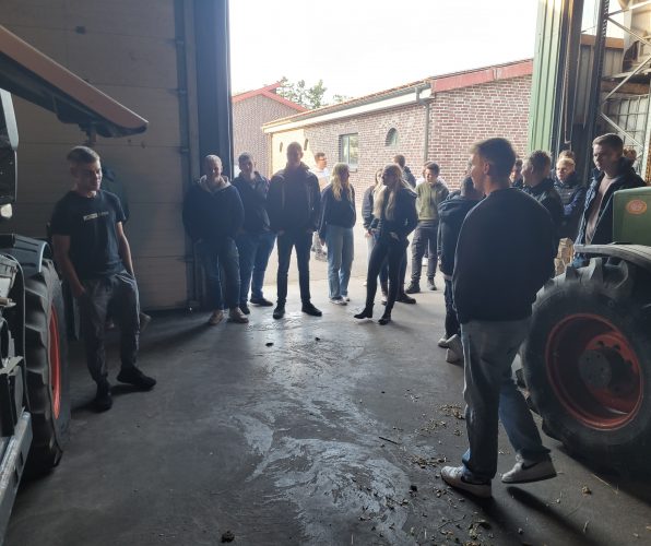 Letzter Anlaufpunkt der Exkursion war die Besichtigung des elterlichen Betriebes des Fachschülers Kevin Hempen in Bösel. Seine Eltern bewirtschaften einen typischen Süd-Oldenburger Hof, der sich auf die Fresser- und Jungsauenaufzucht spezialisiert hat. Kevin Hempen führte seine Mitschülerinnen und Mitschüler über den Hof und erläuterte alle Betriebszweige. Der Familienbetrieb verfügt über 320 Fresseraufzucht-, 60 Bullenmast- und 750 Jungsauenaufzuchtplätze​. Außerdem werden Roggen, Weizen und Silomais angebaut sowie einige Hektar Grünland bewirtschaftet.